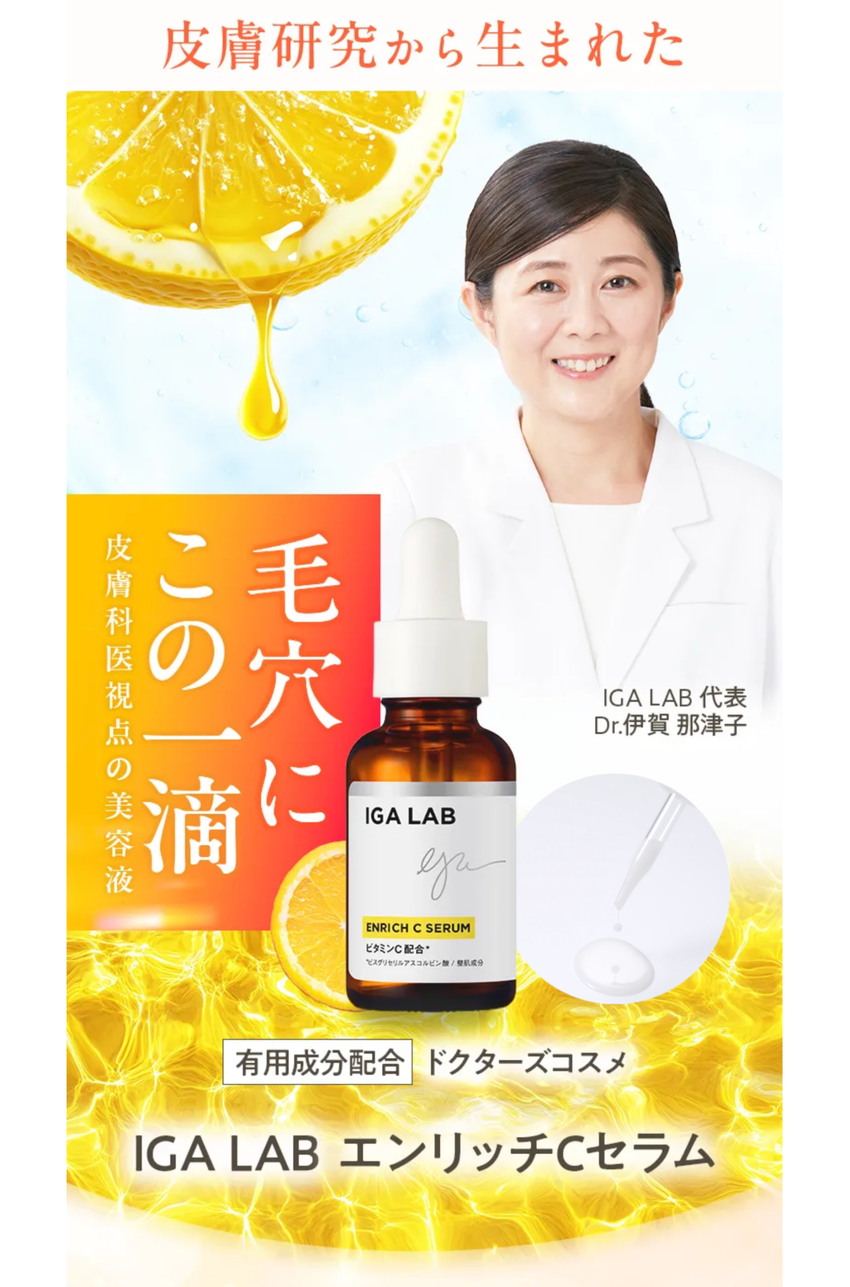 そんな肌悩みの根本にアプローチするために開発されたのが、高濃度ビタミンC誘導体を配合した美容液「エンリッチCセラム」です。ビタミンCは、健やかな肌を保つために欠かせない成分として知られていますが、実は非常に繊細で、肌に届けるのが難しい成分でもあります。
